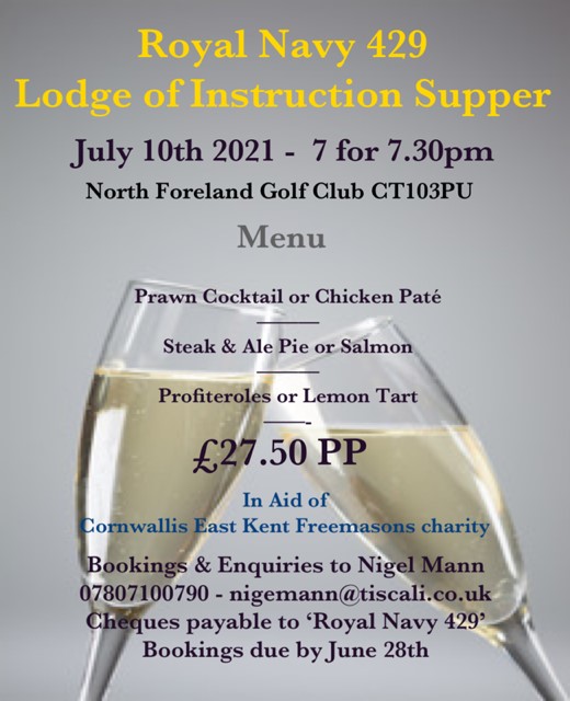 Our Senior warden, Peter Rodd has arranged our lodge of Instruction supper at North Foreland Golf club on the 10th July 2021