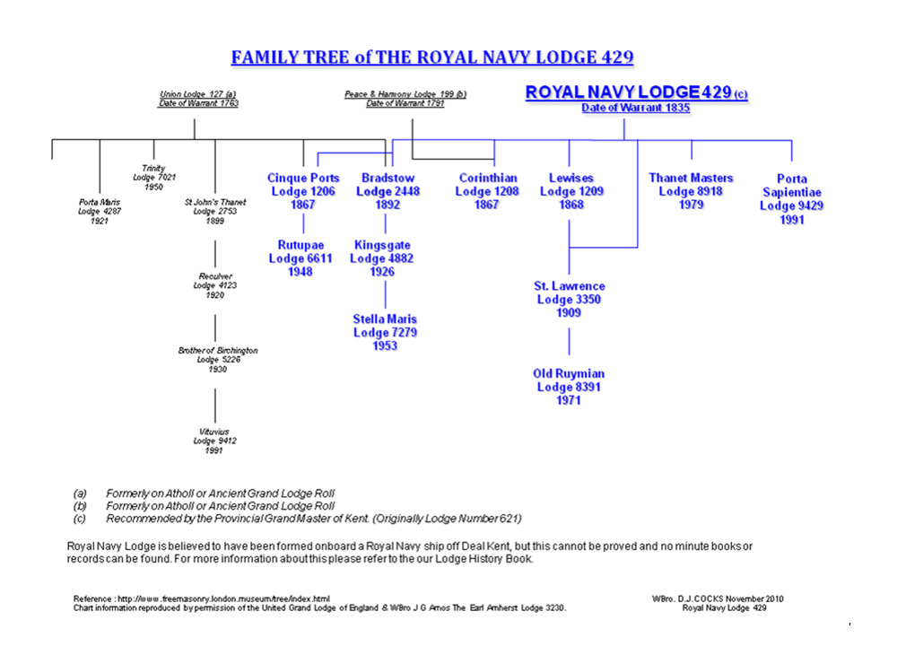 There is a local tradition that the original Royal Navy Lodge was formed by personnel of the Royal Navy and that meetings were held aboard a warship stationed in the Downs.